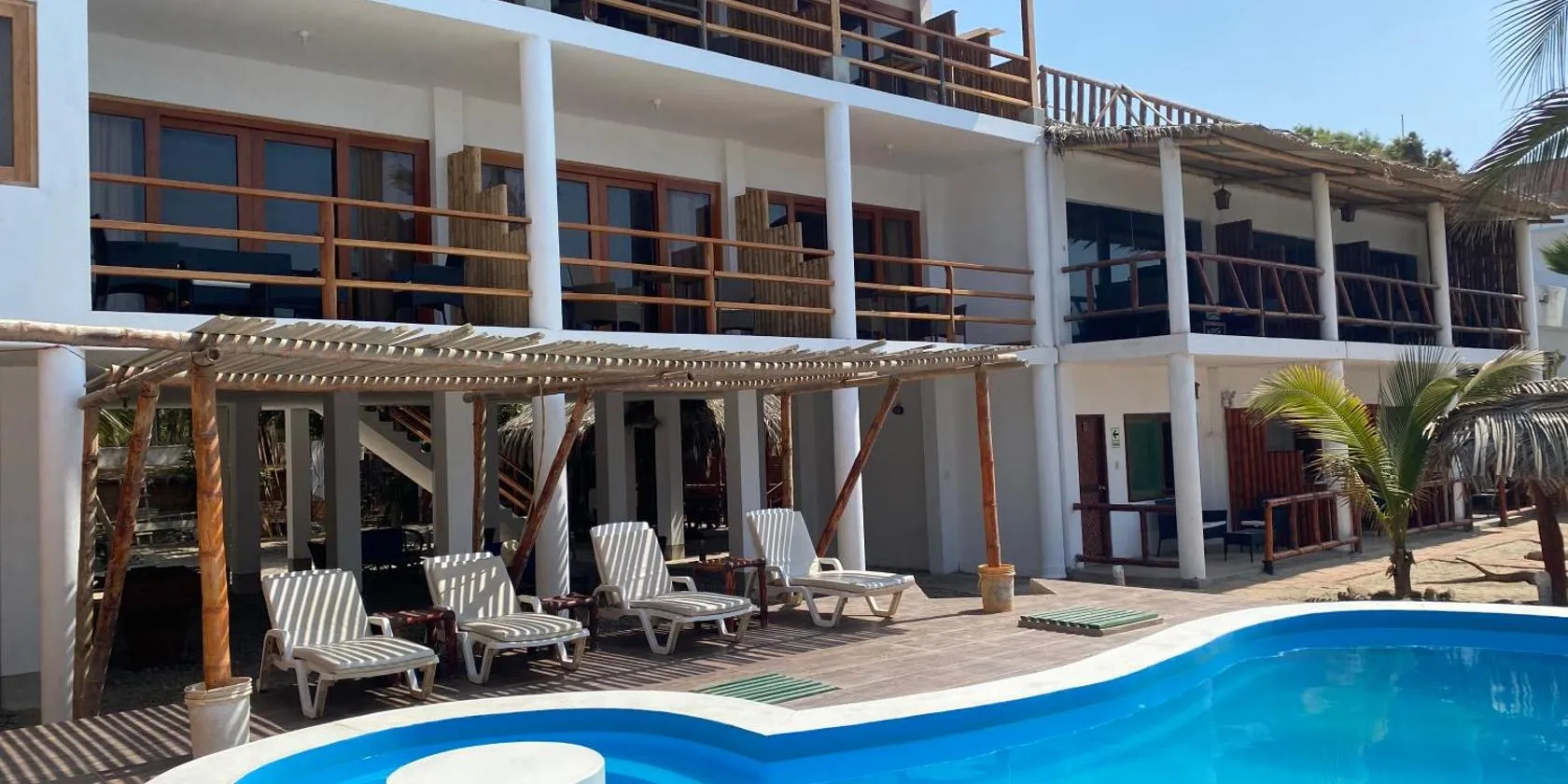 We stayed 2 nights with 7 people in the Villa de sol. The place is very peaceful, a beautiful property on the outskirts of Mancora. The attentiveness and friendliness of the staff is exceptional. They always tried to find the best solution for the guests. Fresh juice and fruit salad as well as eggs prepared to your choice, coffee, bread and butter are part of the continental breakfast. The terrace with pool and loungers in the shade is surrounded by palm trees and has a great view of the lighthouse and the sea. It is only a 10-minute walk to the sandy beach and the town with a wide selection of restaurants of different price ranges, clubs and shops. The clientele is very international, the place is safe. There are a variety of leisure activities such as surfing, kite surfing, horse riding on the beach. It was an unforgettable stay.