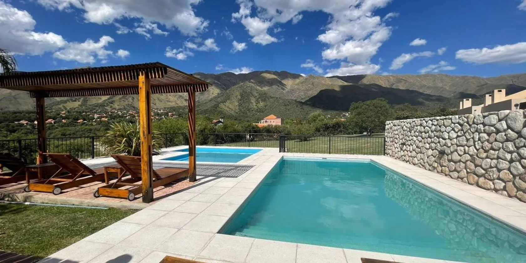 Altos Serranos Apart坐落于梅洛,配备免费WiFi和空调。客人可以使用带室外泳池的花园。内部提供私人停车位。 所有房间均配有山景庭院、带冰箱和烤箱的厨房以及带坐浴盆的私人浴室。部分房间配有露台和/或池景阳台。 这家公寓式酒店提供热水浴池。 住宿配备带桌球的游戏室以及游乐场。 里奥夸尔托机场距离住宿有197公里。