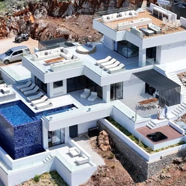 Celestial Luxury Villa Private Pool & Jaccuzi se nachází v destinaci Asprouliánoi a poskytuje venkovní bazén, zahradu, terasu a ubytování s bezplatným Wi-Fi a výhledem na moře.