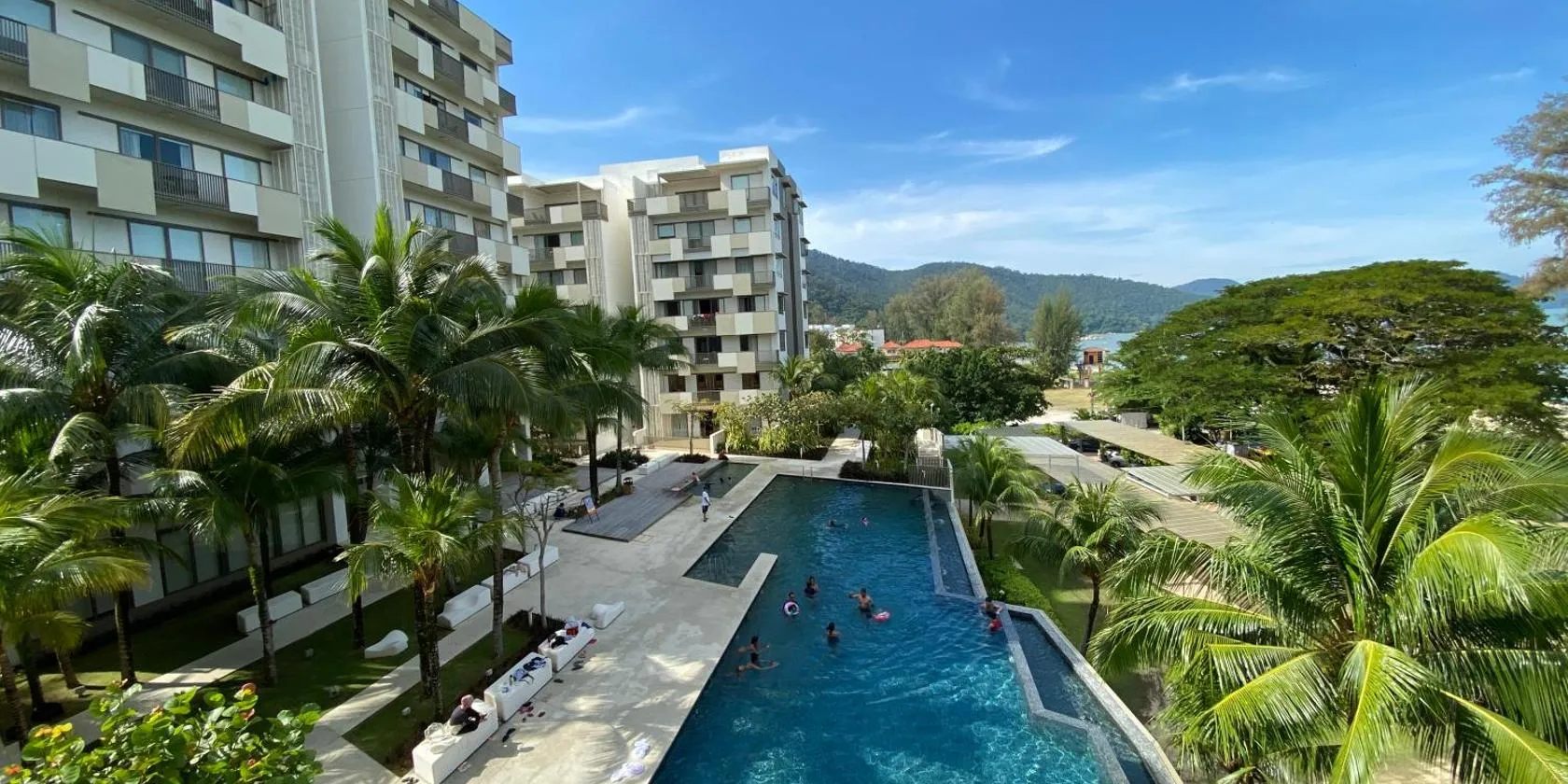 NEW 4Queen Bed 3 Room 2CP near Gurney with tvbox and KTV Set se může pochlubit výhledem do zahrady a poskytuje venkovní bazén, sdílený lounge a terasu.