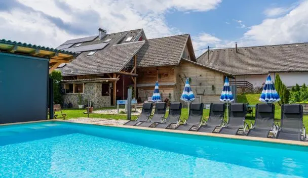 Vila Lesce with heated outdoor pool propone una piscina, un giardino, una terrazza e la vista sulla montagna nella città di Lesce. Tutti gli alloggi hanno il WiFi gratuito.