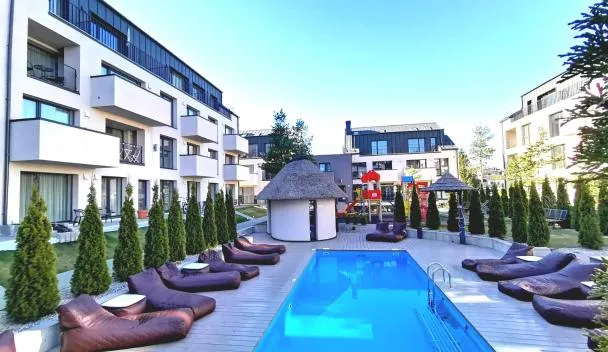 Hill Namai propone un alloggio con piscina all’aperto stagionale, giardino e terrazza a Palanga e dispone di WiFi gratuito e vista sulla piscina.