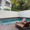 Chambre spacieuse avec une belle vue, un balcon et une belle piscine